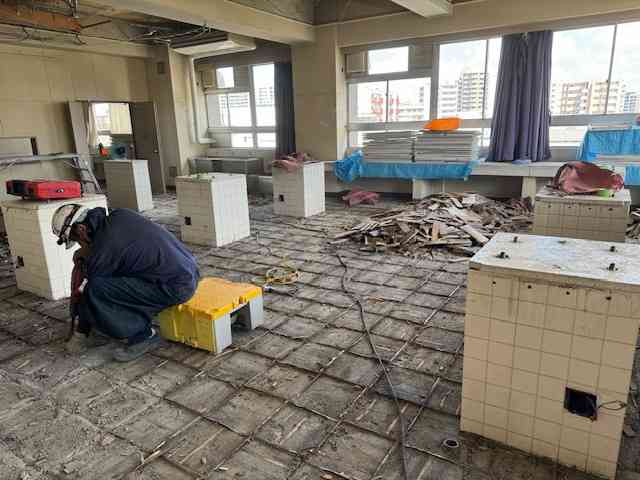 校庭・1階廊下・3(&4)階 理科室・4階教室の様子です。 校舎内では一つ一つ丁寧に手作業をされています。 根気のいる作業だと思います。瓦礫も人手で運び出されています。 暑い中、ありがとうございます。